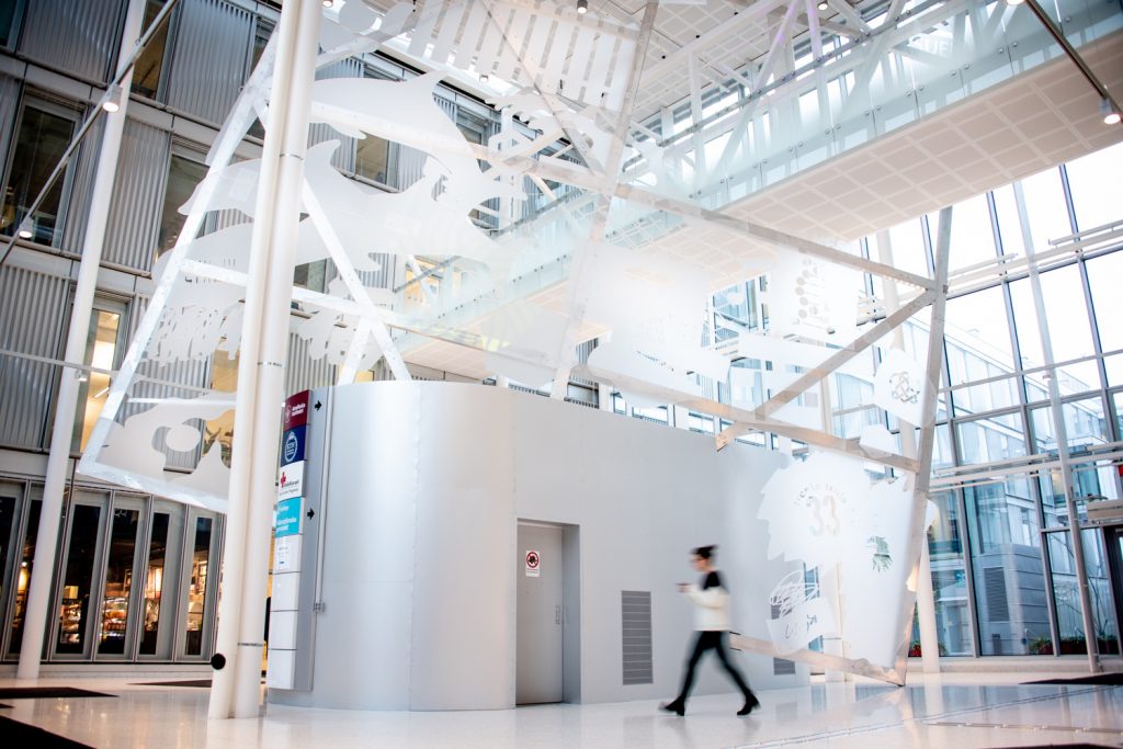 Bild 1 av 1. Ilja Karilampis verk Uninterruptable i entrén till forskningshuset NEO/TFH för KTH KI i Huddinge. Foto: Ricard Estay