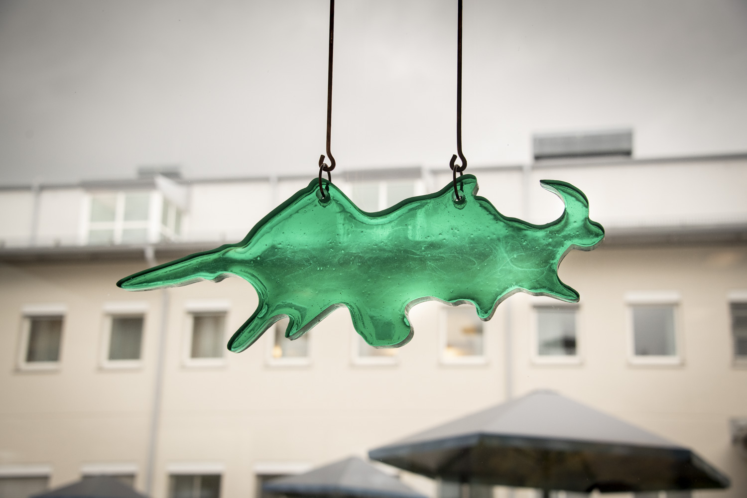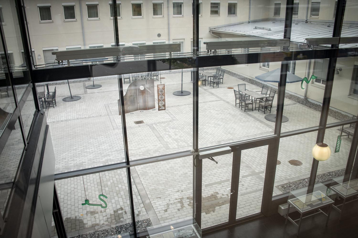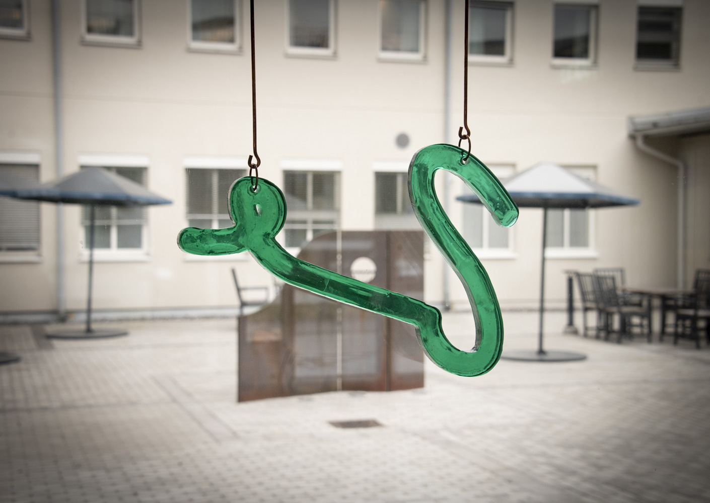 I det stora glaspartiet som vetter ut mot innergården, pendlar unika objekt i grönt glas och koppar som utgör nycklar eller ett alfabet in i deras sammanvävda arkivbetraktelse. Arkitekturen blir som en vitrin där de samlat de mest innovativa och varierade sätt att kommunicera. Alla dessa former blir en lapptäckesberättelse, ett sammelsurium, där varje litet tecken ur alla dessa olika alfabet är en möjlighet till nya berättelser.