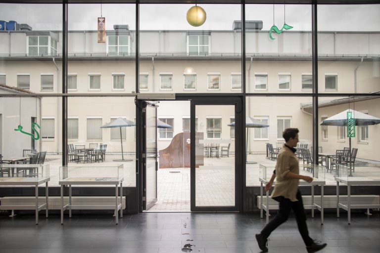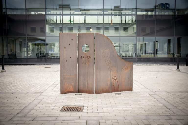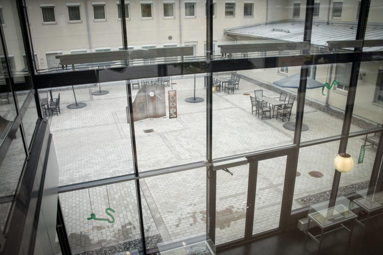 Mitt på innergården står ett objekt som för tankarna till en skärmvägg, en tidskriftssamlare eller en berså. Vikskärmen har håltagningar, inskriptioner och symboler som knyter an till objekten i fönstersektionerna. Skalan på vikskärmen relaterar till människokroppen och skapar en intim känsla av att kunna skyla sig.