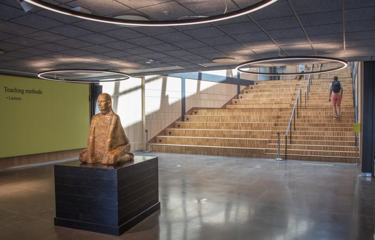 Det första som möter oss när vi kommer in i entrén är den ensamt lysande lampgloben. Här förs tankarna till att upplysa, belysa och genomlysa.