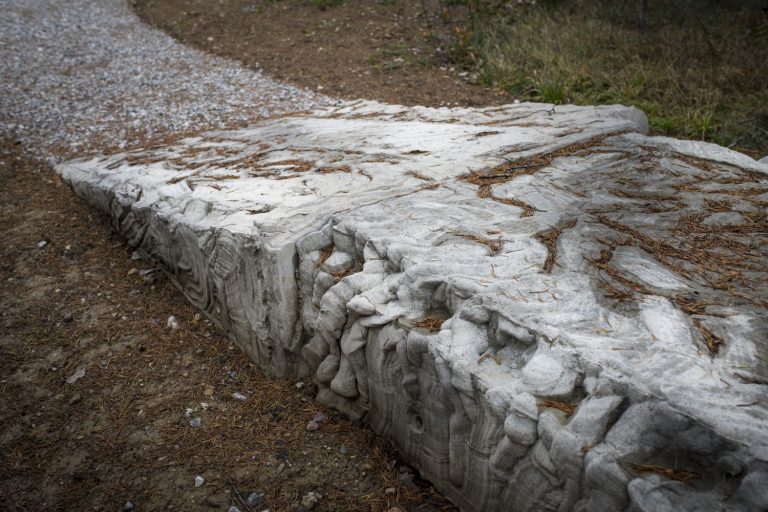 Utanför multifunktionshuset skär den storskaliga gestaltningen i betong genom landskapet som en rak linje men tar på samma gång hänsyn till landskapets karaktär och förutsättningar. Konstverket skapar en rumslighet i dialog med platsen och naturen, där verket både tillgängliggör och inbjuder till användning av naturparken. Här är Genväg en plats för eftertanke och vila, men skulpturen kan också användas som en stig och passage – en genväg. Betongens karga men ändå mjuka uttryck och materialitet kommer att successivt växa ihop med naturen och platsen när mossa, lavar och barr blir en del av konstverket.