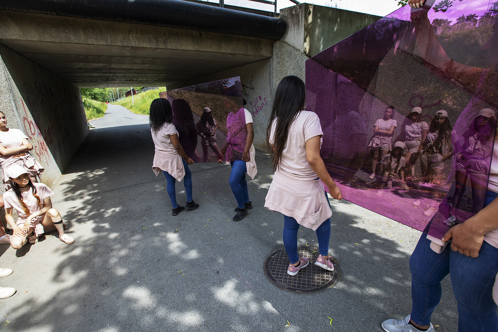 Filmen visar en fysiskt krävande koreograferad parad där gruppen långsamt rör sig längs bostadsområdets gångvägar och grönområden, ackompanjerad av ljuden från gräsklippare, fåglar och underhållsfordon. Tillsammans bär de stora och tunga lila glasskivor, stannar upp mellan rörelserna och byter grepp. Skivorna reflekterar det rosa, gröna och lila från de omgivande betongfasaderna. Kameralinsen placerar allt på samma nivå: gester, omgivning, ljud, rörelser och arkitektoniska motiv vävs samman i en enhetlig upplevelse. Rörelsen är målmedveten och metodisk, men samtidigt sårbar. Ett litet misstag och glasskivorna skulle gå i kras.