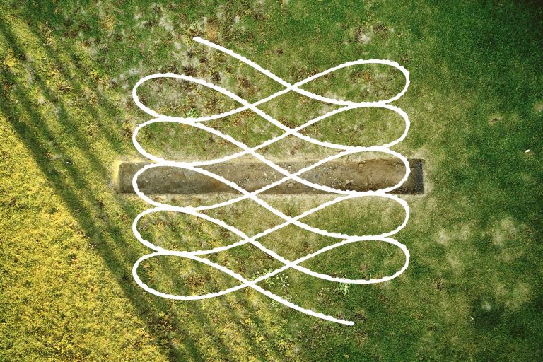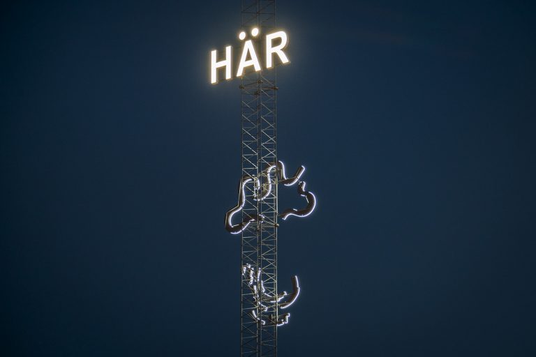 36 meter upp i luften lyser ordet HÄR. Nedanför och riktat söderut svävar en kartbild över Kungsmarken, Gullaberg och Mariebergs bostadshus sett från ovan. Verket, Kollektiva kroppen, syns på långt håll i Karlskrona.