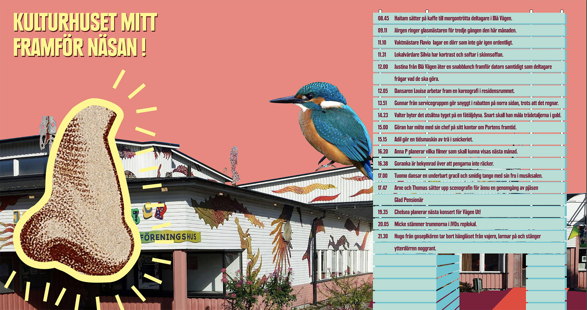 Den lokala gruppen från kulturhuset och brittiska konst- och arkitekturkollektivet muf architecture/art beslutade gemensamt att synliggöra kulturhuset genom tillfälliga installationer och en lokal festival där vissa av husets verksamheter flyttades ut och gjordes publika. Festivalen, i form av en månads programläggning, ägde rum hösten 2017 och installationerna byggdes av de lokala föreningarna, med undantag för en stor lysande näsa som muf architecture/art producerade. Näsan placerades på en lyktstolpe framför kulturhuset som i åratal stått släckt och vars ägare, trots återkommande utredningar, fortfarande är oklar. Näsan blev en symbol för att belysa det som finns ”right under your nose” – mitt framför näsan – det som du inte ser för att du är för upptagen med att söka efter det nya. Näsan blev också ett sätt att visa att en långvarig förändringsprocess är på gång.