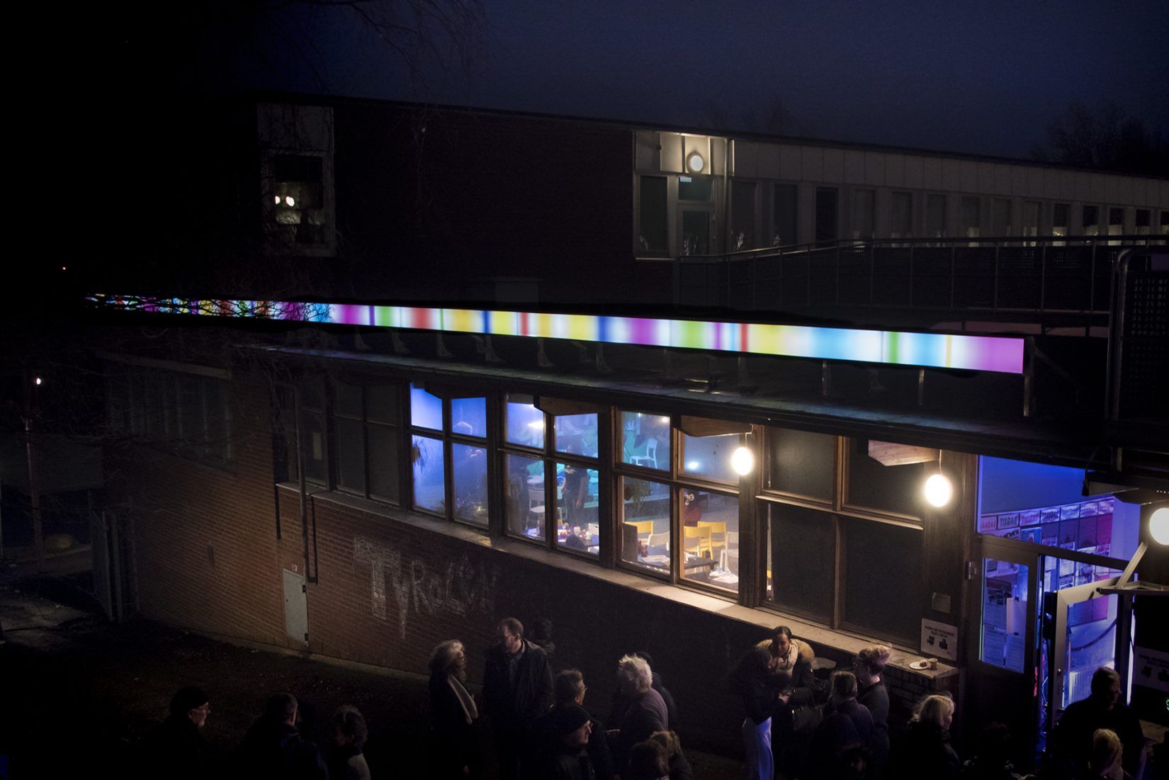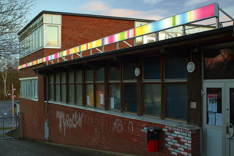 Aleksandra Stratimirovics 45 meter långa ljuskonstverk Ljuslinje för Tyrolen i Tynnered, Göteborg, tar ett fast grepp runt den rödteglade Tynneredsskolans slätmurade fasad.