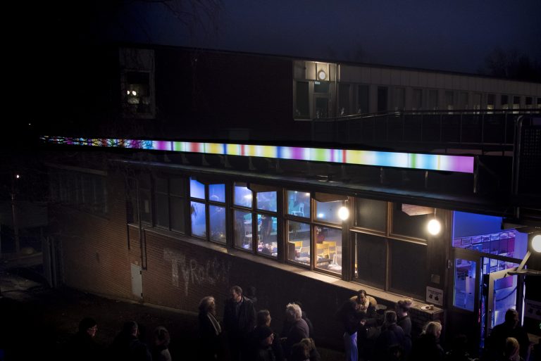 En linje av ljusboxar i skiftande färger löper längs med en tegelbyggnad, det är dag och ljuslinjen är släckt.