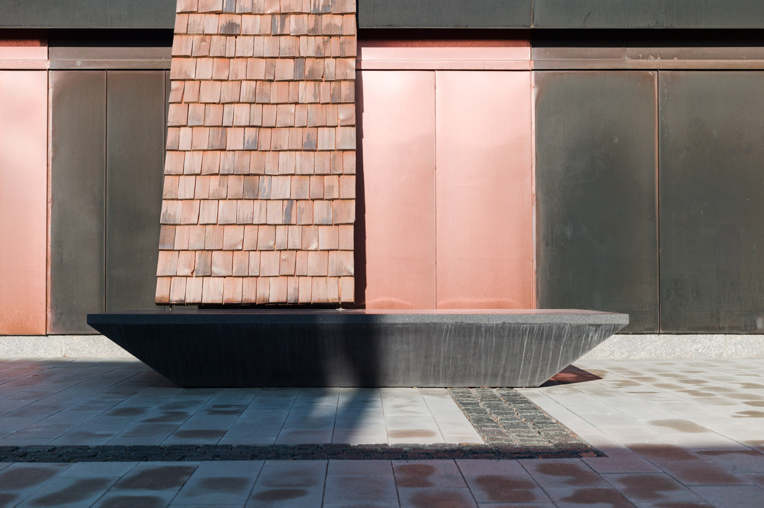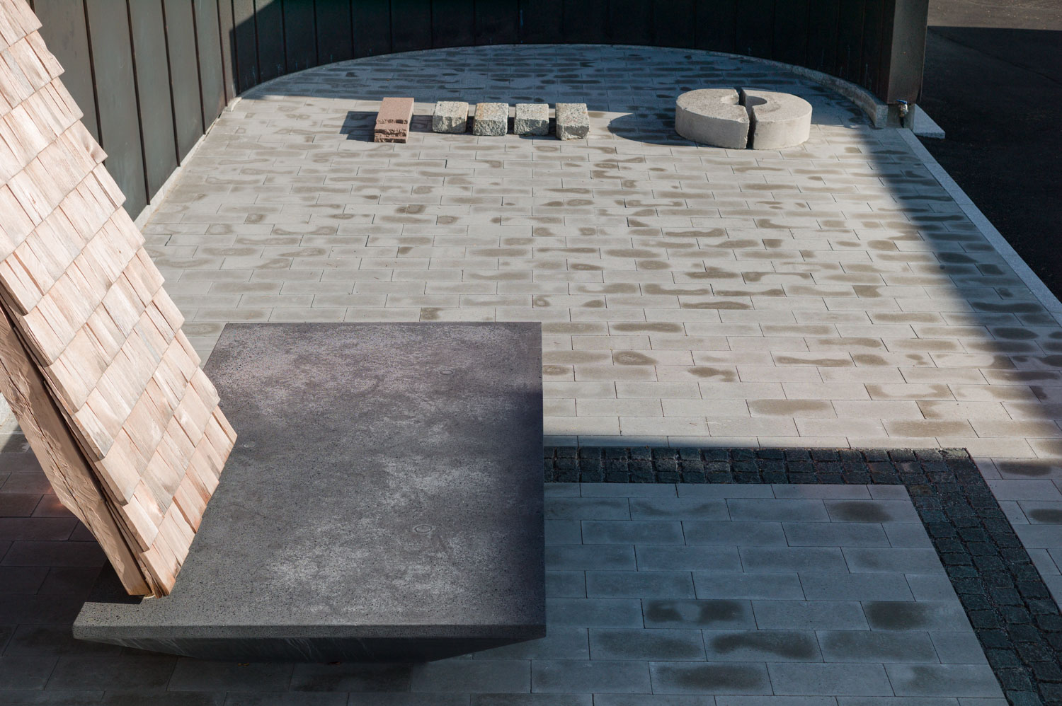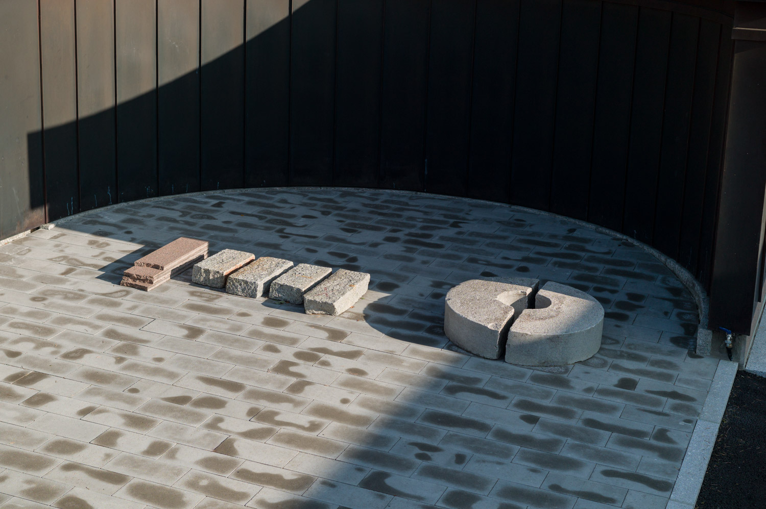 Till betongfundamentet har Jenny Magnusson lånat måtten från Stiga pingisbord. Det svenska företaget Stiga började sälja bordtennisprodukter 1944 och säg det fritids eller den gillestuga i svenska radhus som inte haft ett Stiga pingisbord? Betongfundamentet fungerar både som en hävstång och förankring, en orienteringens nollpunkt. Sträckningen som träskulpturen gör upp och den svarta linje av sten som vinkelrätt löper ut och mot entrén. Betongkroppens yta berättar också om ett inne som är ett ute med sin blankpolerade yta.