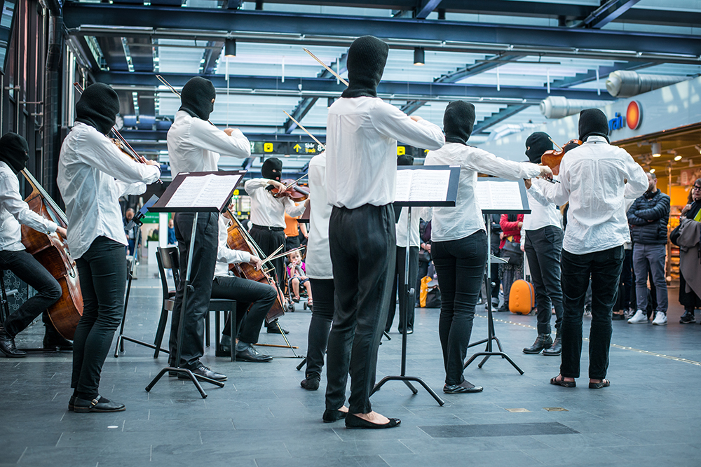En orkester sitter och stämmer sina instrument. Publiken väntar. Plötsligt drar musikerna på sig svarta masker. En känsla av obehag sprider sig. Adagio för stråkar av Samuel Barber, känd som ett av världens sorgligaste musikstycken. I spänningen mellan obehag och skönhet uppstår verket.