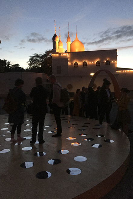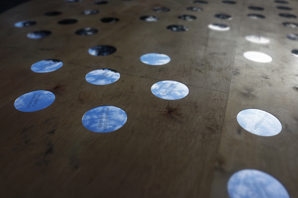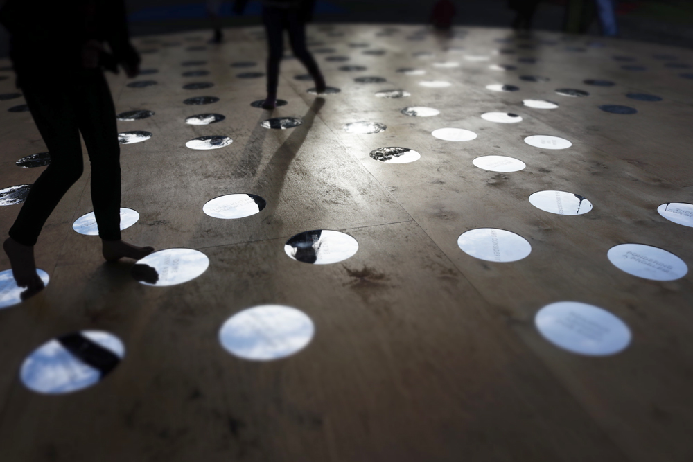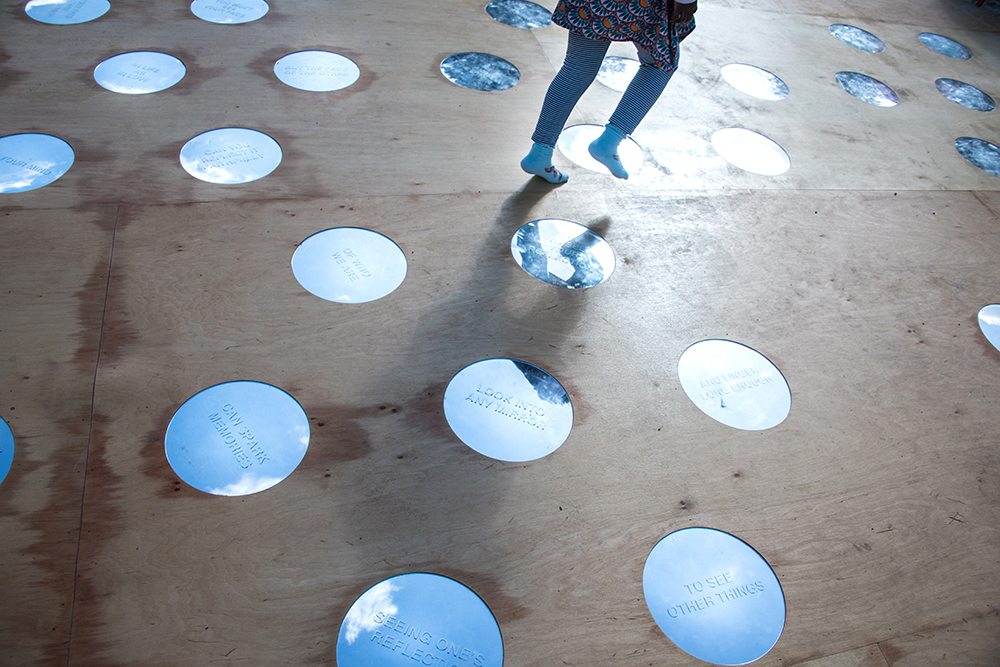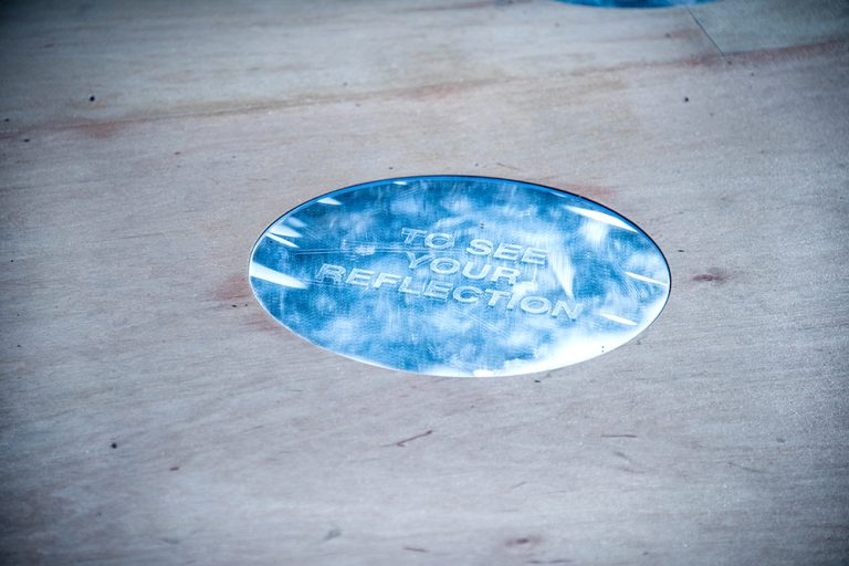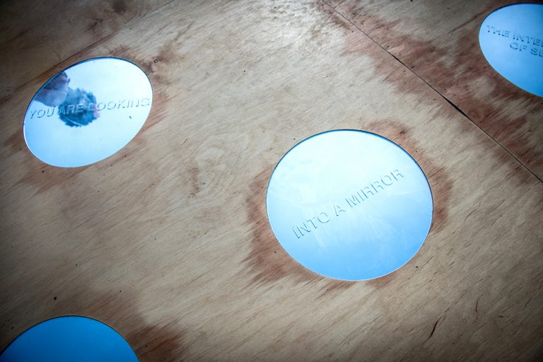 Detalj. Trägolv med en cirkulär spegel i vilken står den engelska texten: "To see your reflection". Nisrine Boukhari, Imaginary Wholeness/Fragmentary Reality