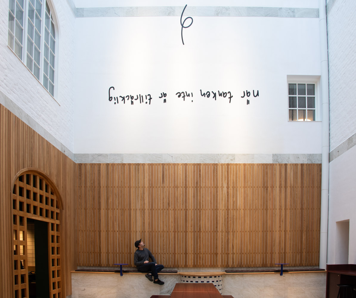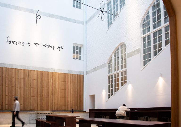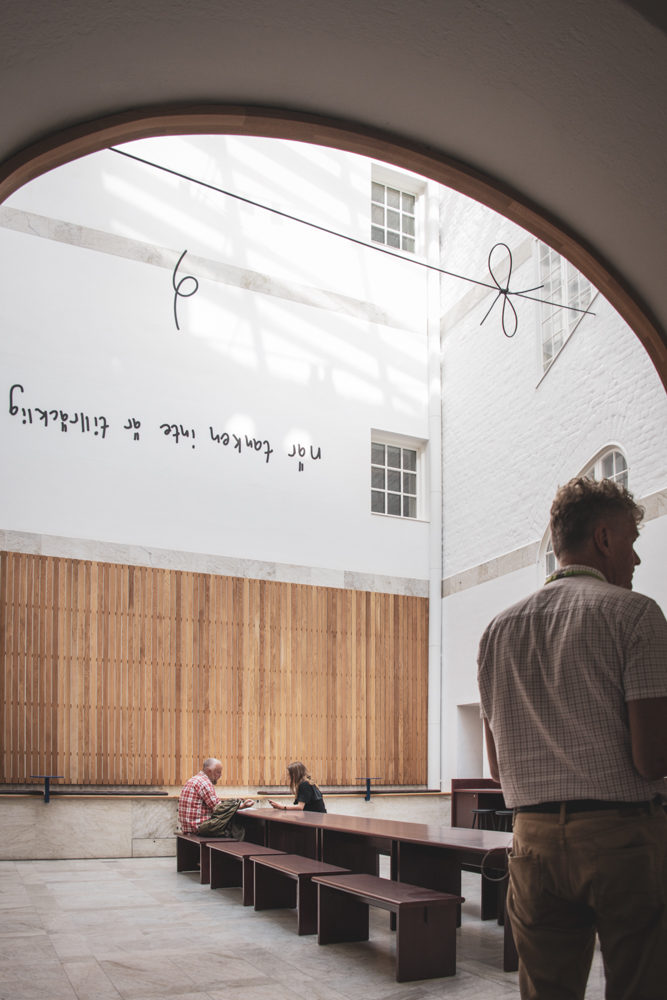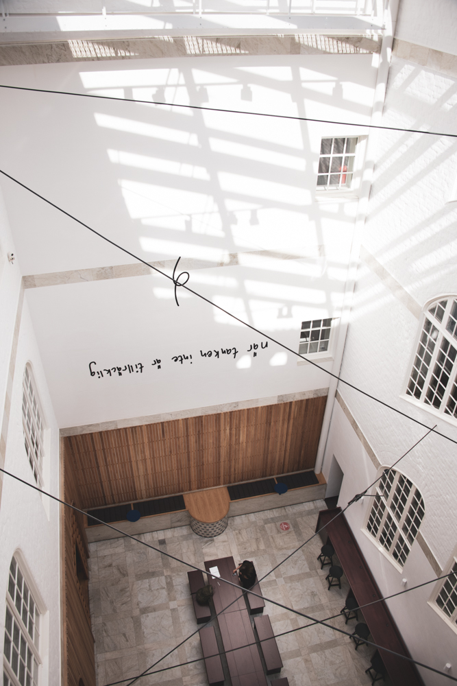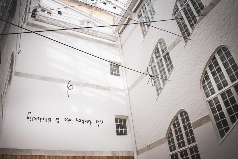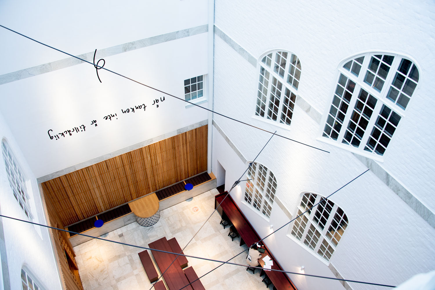 En innergård med glastak. På väggen finns bokstäver och svarta linjer syns ii luften genom rummet.