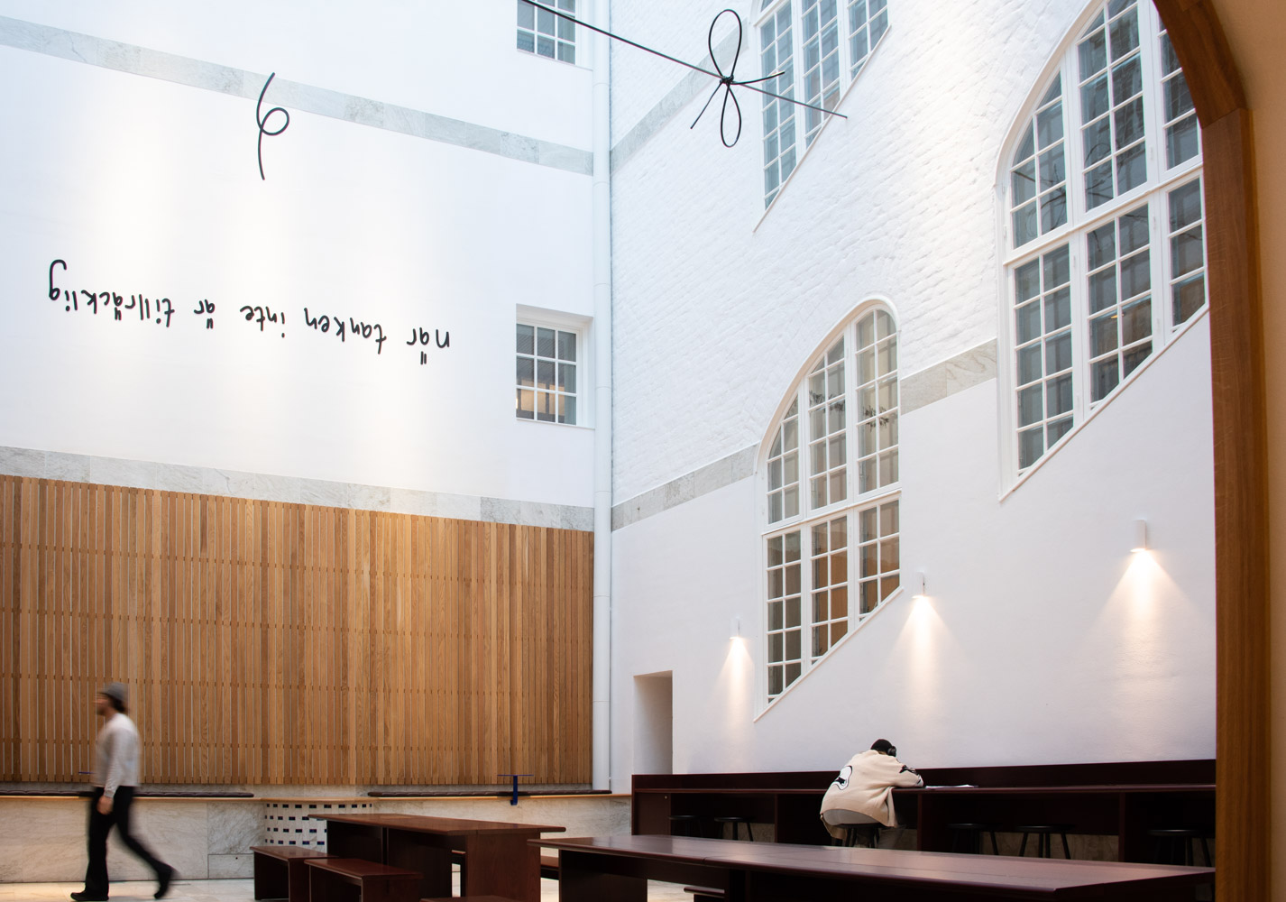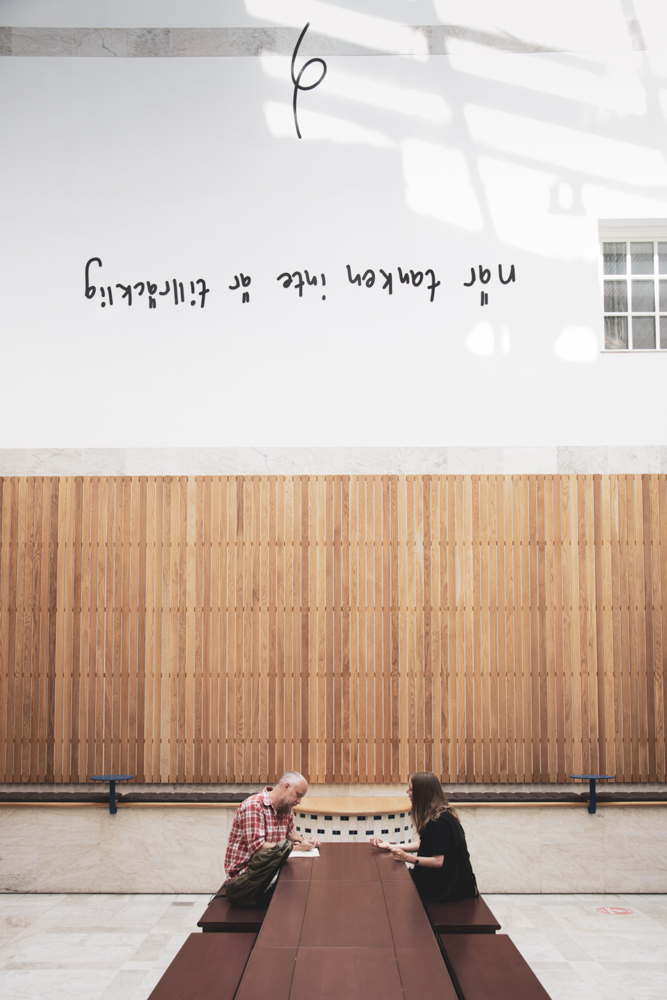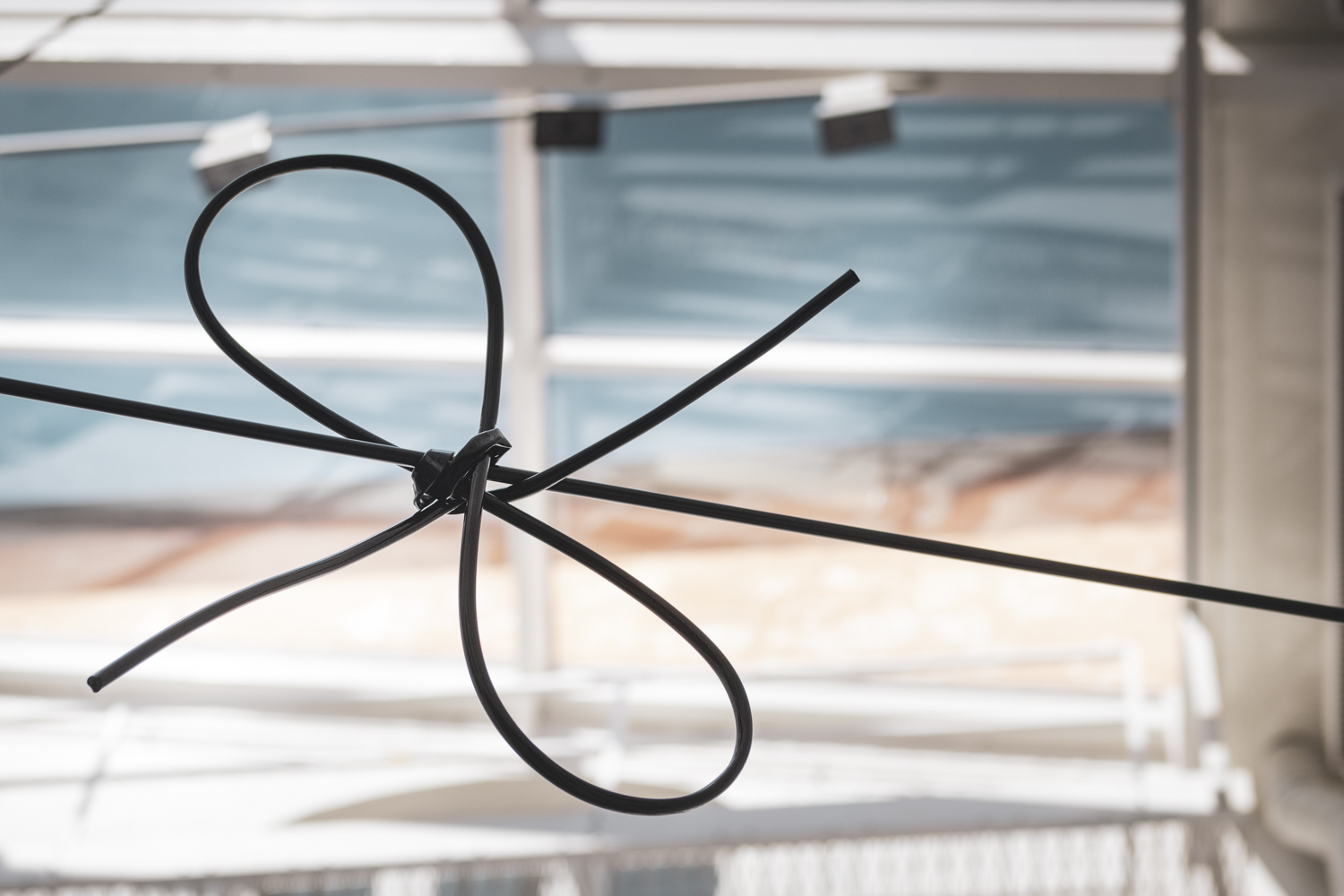 Thierfelder Tzotzis gestaltning skär genom luften och tar plats på väggarna, för att avteckna sig mot ljusgårdens egensinniga och speciella arkitektur. Det påminner om tankar som löper, binder samman och slår knut på sig själv. Verket uppmanar oss på ett underfundigt sätt att nå bortom det vi redan känner till och tar för givet. Att vrida och vända på det vi ser, att ifrågasätta det vi kanske allt för ofta tar för givet.