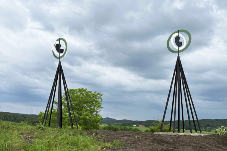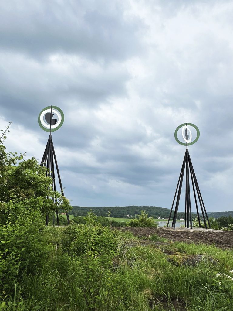 Katarina Löfström har i flera verk intresserat sig för abstrakta symboler som används för kommunikation och för att ange riktning. Det kan vara sjömärken men även optiska telegrafer, semaforer eller måltavlor. De två sju meter höga skulpturerna är gjorda av trä och lackerat stål och knyter an till denna tematik. Men de kan också tolkas som två ögon, där delar av ögonen ändrar riktning och ständigt är i rörelse.