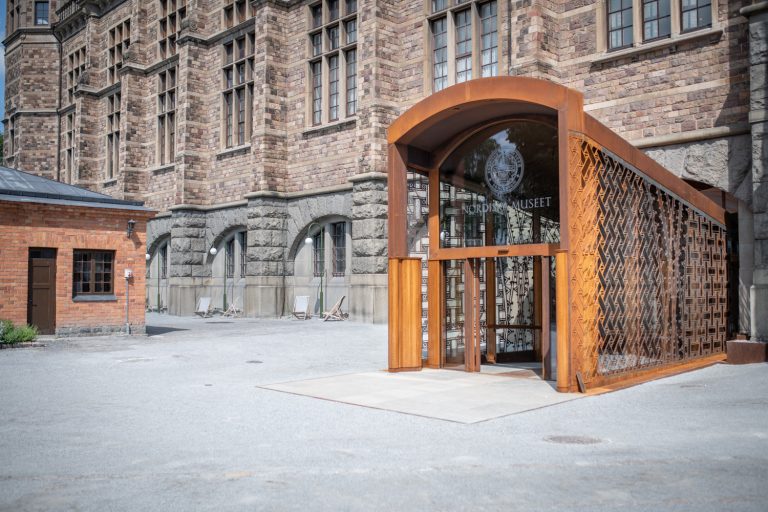 På natten och under den mörkare årstiden, lyser entrén som en inbjudande ljuskropp.