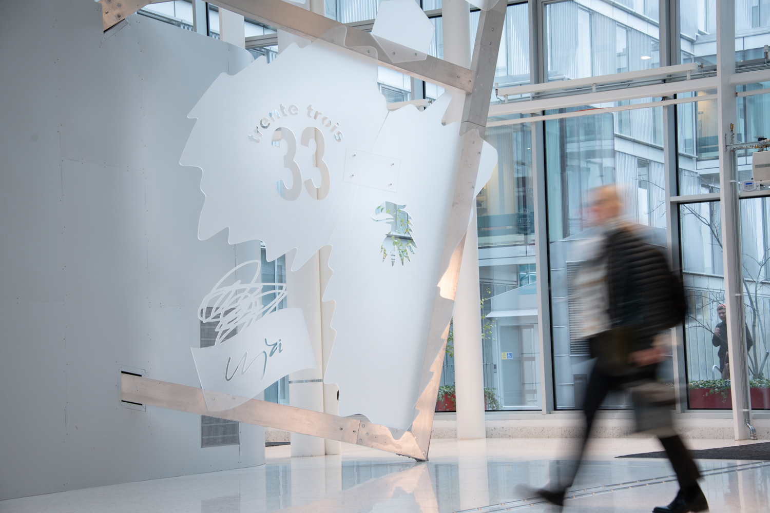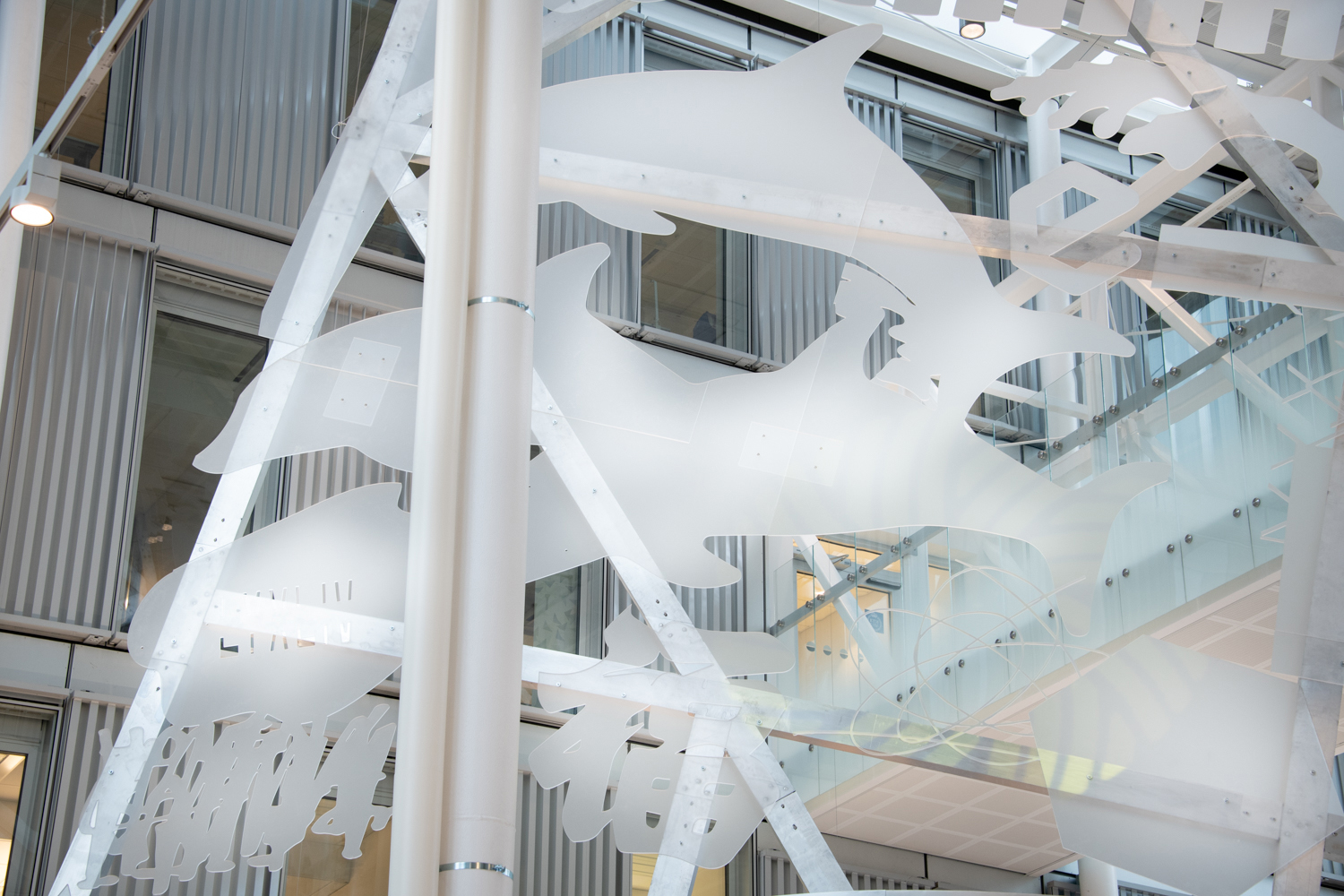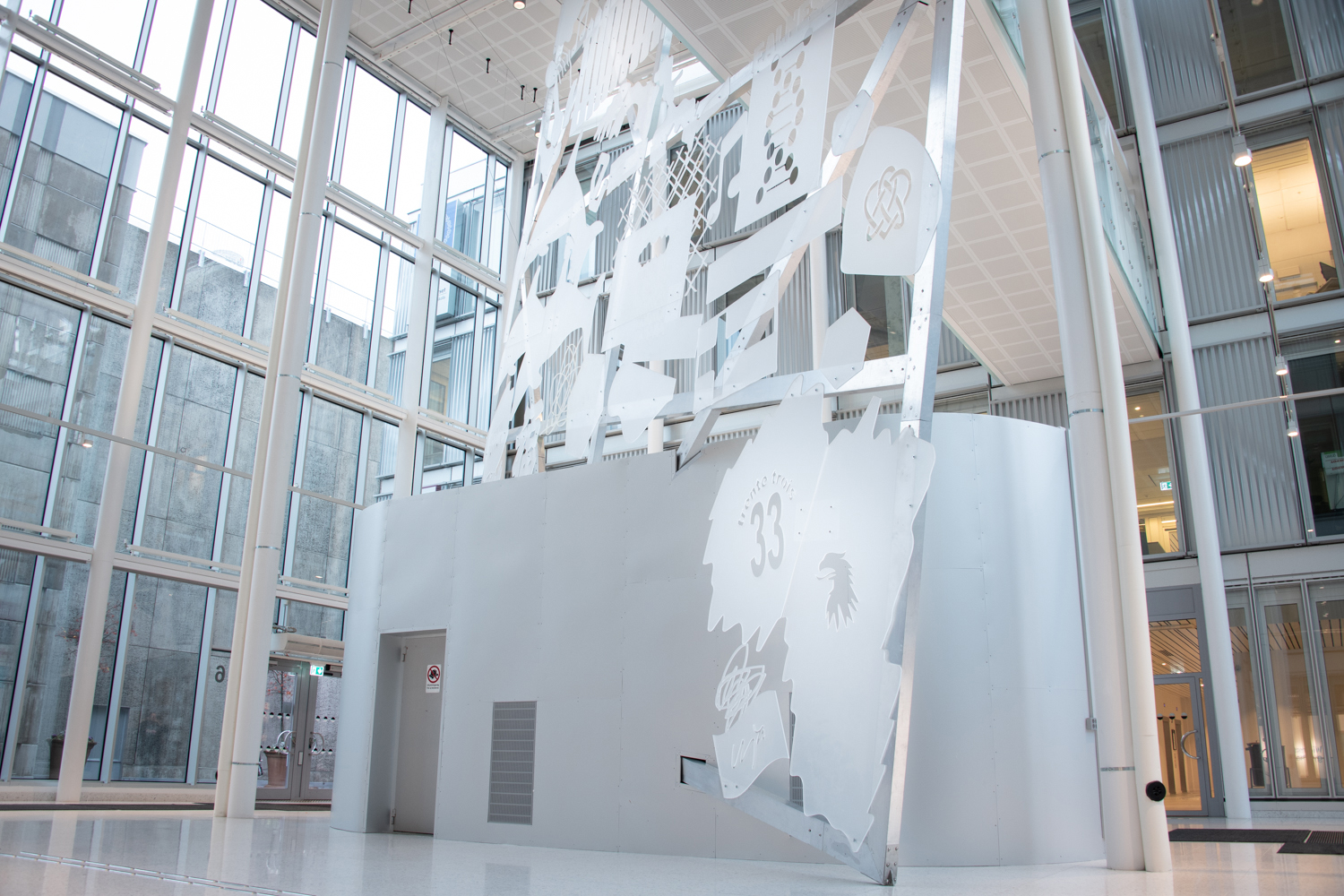 Verket Uninterruptable av Ilja Karilampi är en monumental skulptur som är placerad i entrén mellan forskningsinstituten NEO/TFH. På ramen sitter utskurna siluettformer i frostat akrylplast monterade som beskriver världen genom ihopsatta symboler, tecken och former.