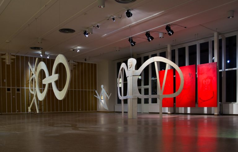 I installationen Gammalt språk – nya former och flyktingar (Dološ giella – ođđa hápmi ja báhtareaddjit), som utgörs av stora träskulpturer, manifesterar Aage Gaup sitt intresse för ett visuellt språk, som till exempel hittas bland symbolerna på Nåjdernas trummor. I utställningen visar han också upp små kolteckningar, ritade av en barnhand och för evigt förknippade med ett gömt trauma.