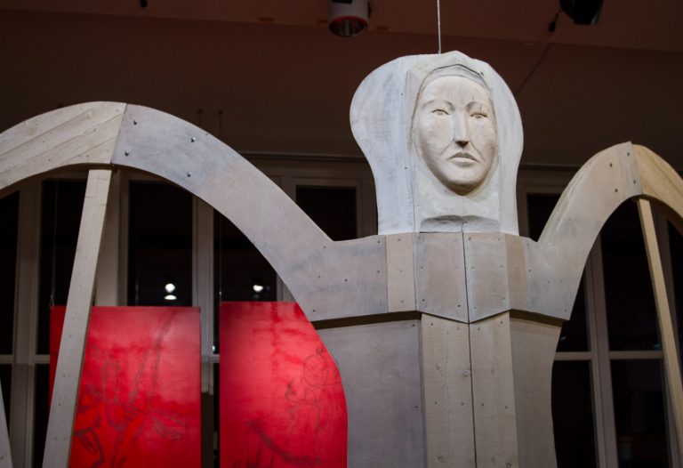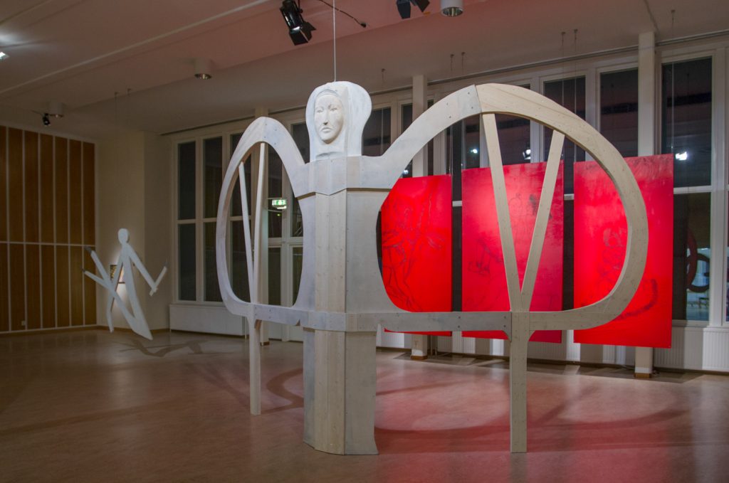 Del av installationen Dološ giella – ođđa hápmi ja báhtareaddjit (Gammalt språk – nya former och flyktingar) Johtin/Reisen, 1989. Trä, rot, renskinn.