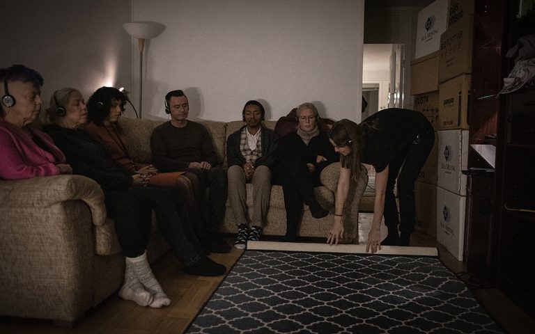 I västvärlden har vi vant oss vid ett samhälle som skiljer på det offentliga och det privata. Kontrasten mellan det offentliga och det privata är knivskarpt tydlig. Betraktaren för hörlursföreställningen Vi är den här platsen eller tillståndet stiger in i en lägenhet i Bergsjön i Göteborg, rakt in i en okänd persons hem.