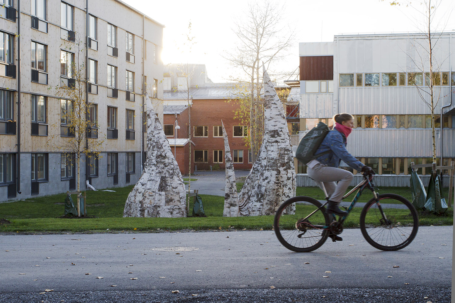 Sculptures made out of birch bark on a green lawn. There's a low building in the background.