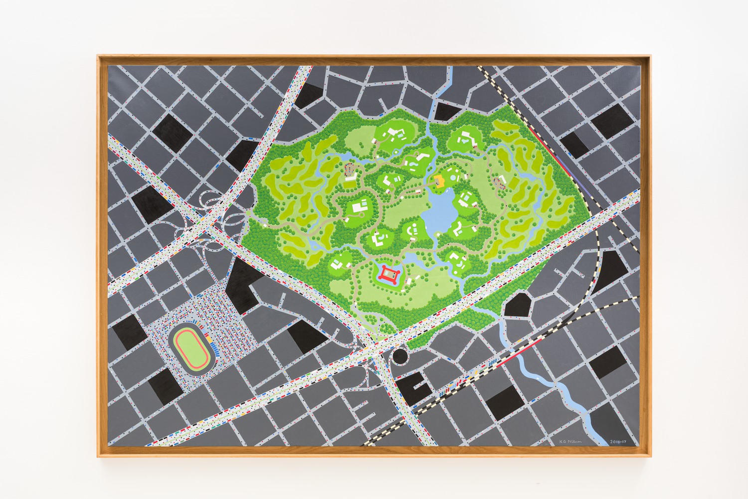 Gated community av KG Nilson föreställer en karta över en stad där konstnärens abstrakta formspråk kommer till uttryck. I målningens blickpunkt finns ett prydligt samhälle med golfbana, pampiga byggnader och frodig natur. Hör konstnären berätta mer om konstverket i filmen nedan.