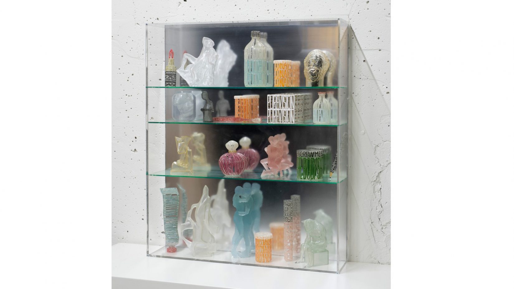 Läppstift, parfym, medicinförpackningar. Allt samsas på glashyllorna i ett badrumsskåp i verket What Keeps Me Going II (2019) av Thomas Broomé där även figuriner av människor och ansikten tar plats.