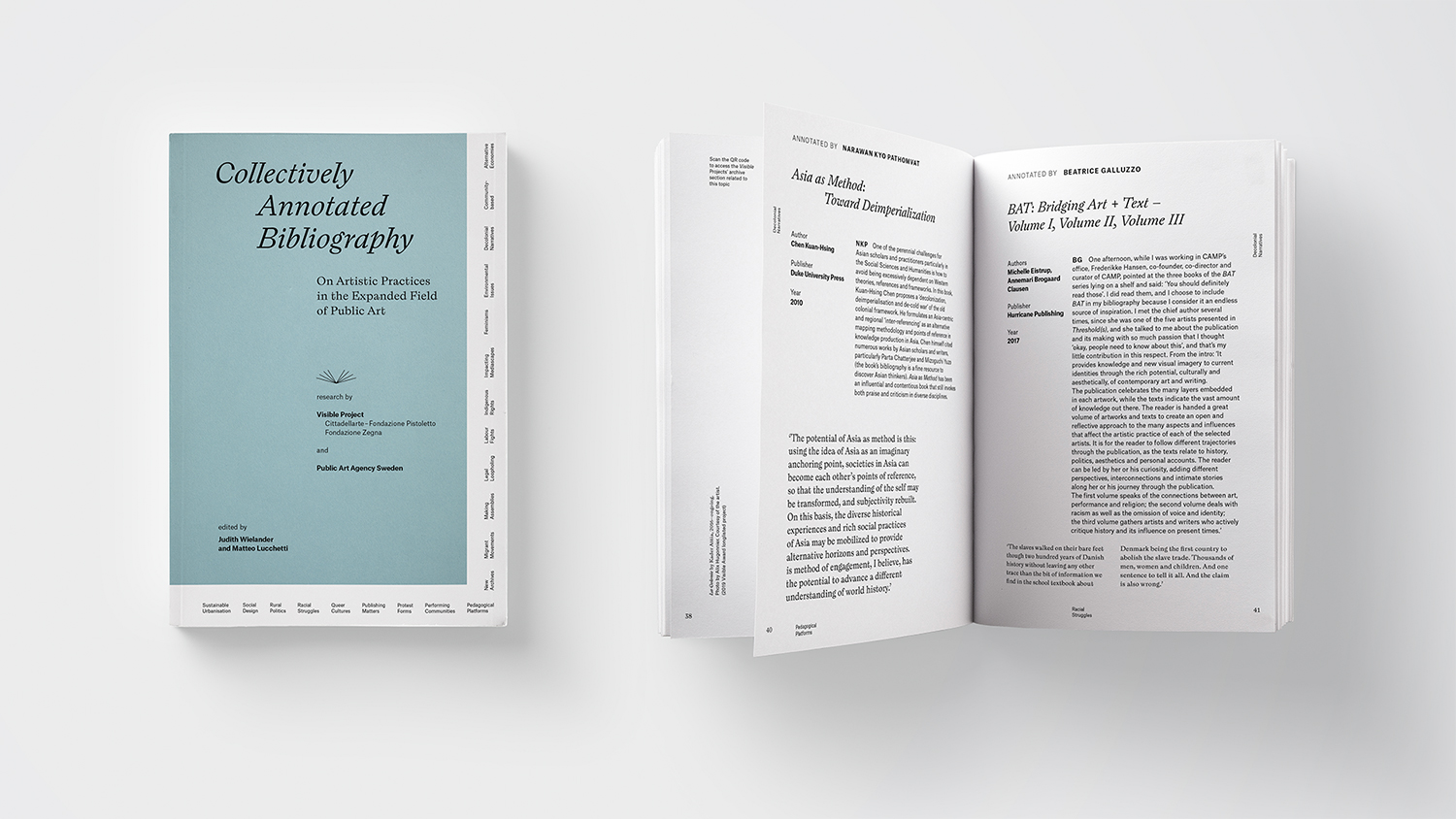 Publikationen Collectively Annotated Bibliography. On Artistic Practices in the Expanded Field of Public Art introduceras genom ett samtal med curatorn Gabi Ngcobo, forskaren Andrea Phillips samt filosofen Emanuele Coccia som reflekterar över vad det innebär att skapa en bibliografi eller läsguide idag som kan inspirera och informera konstnärer, forskare och allmänhet inom fältet offentlig konst.