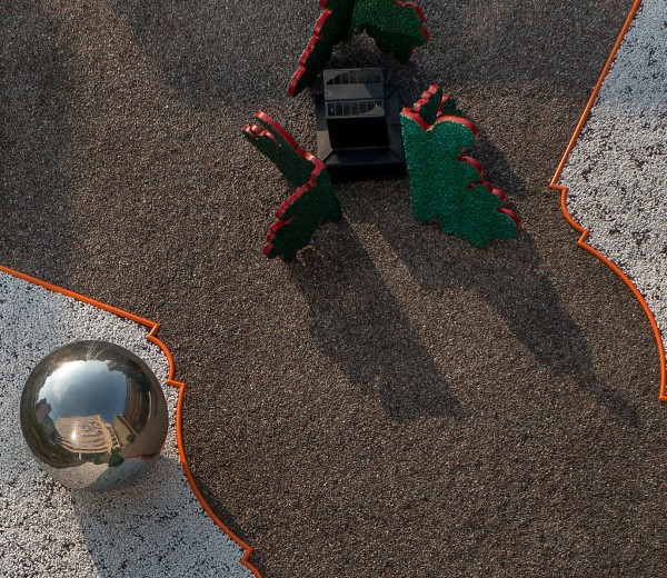 Grus i olika färger separerade av röda kanter och skulpturer.