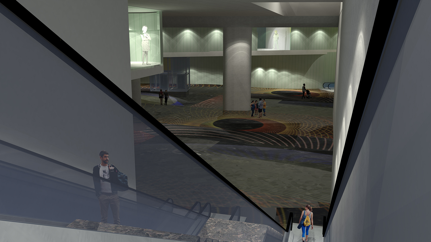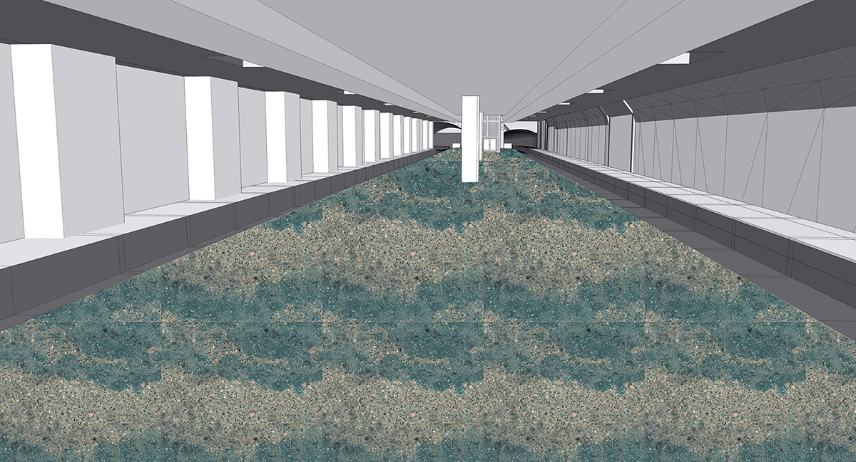 Infinity Station föreslår en konstnärlig gestaltning på plattformsnivån, där den plattform som först tas i bruk benämns Open Station och den tomma tvillingtunneln Ghost Station. Idén är att skapa en optisk illusion genom en uppsättning speglar som installeras på plattformarna. Speglarna återger en oändlig passage (Ghost Station) som visar sig utifrån resenärens synvinkel när de befinner sig på plattformen, identisk med den plattform resenären befinner sig på men utan mänsklig närvaro.