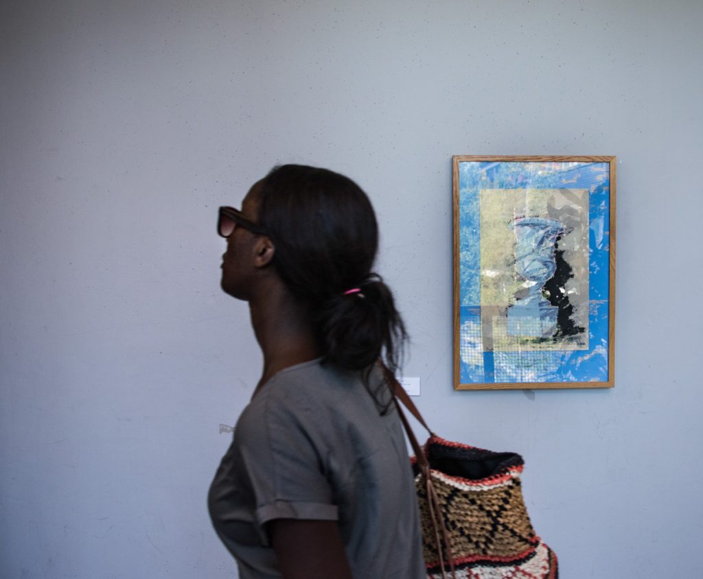 Kvinna går förbi en målning som hänger på en vit vägg