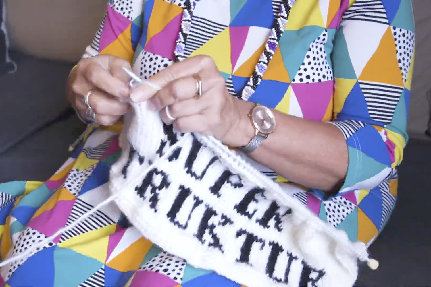 Lisbet Torkelsdotter: Vi hade ett möte där vi gjorde en skiss tillsammans utifrån lagets önskemål. Jag har gjort ett stickat knäskydd som kommer att sitta utanpå det faktiska knäskyddet. Det är rött och rosa, och jag har använt glittertråd. I mitten har ett rullskridskohjul blivit ett kvinno- och hen-märke, och ovanför är det en stjärna. Baksidan är resår-stickad så att det blir lätt att ta på sig och sitter åt ordentligt.