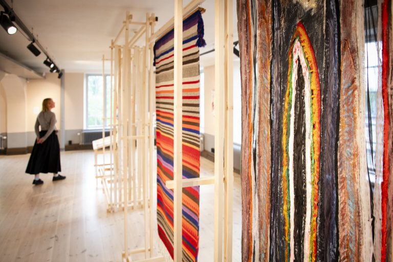 I den här utställningen har konsten som i vanliga fall finns att uppleva på många tusentals offentliga arbetsplatser i hela landet, tvärtom fått flytta in i våra utställningslokaler för att undersöka vad den textila konstens uttryck betyder i våra gemensamma offentliga rum. Men liksom 1970-talets konstnärer flyttar konstnären Sarai Alvarez Riveros in i utställningsrummen med sitt arbete Den Sociala Väven (2022). Ett verk som vanligtvis tar plats i stadsrummet, på trottoaren eller under festivaler, där de som går förbi uppmanas att stanna upp och brodera en stund med konstnären. Verket kommer att utvecklas under ett antal tillfällen under utställningsperioden, då du som besökare kan vara med och skapa det.