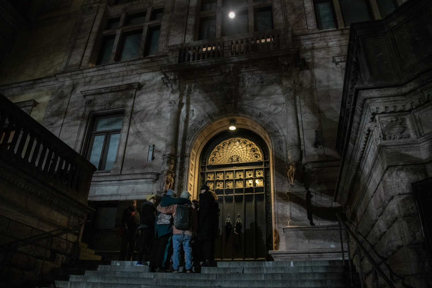 I verket Förhandlingen lyser en lampa på fasaden på Konstakademien i Stockholm.